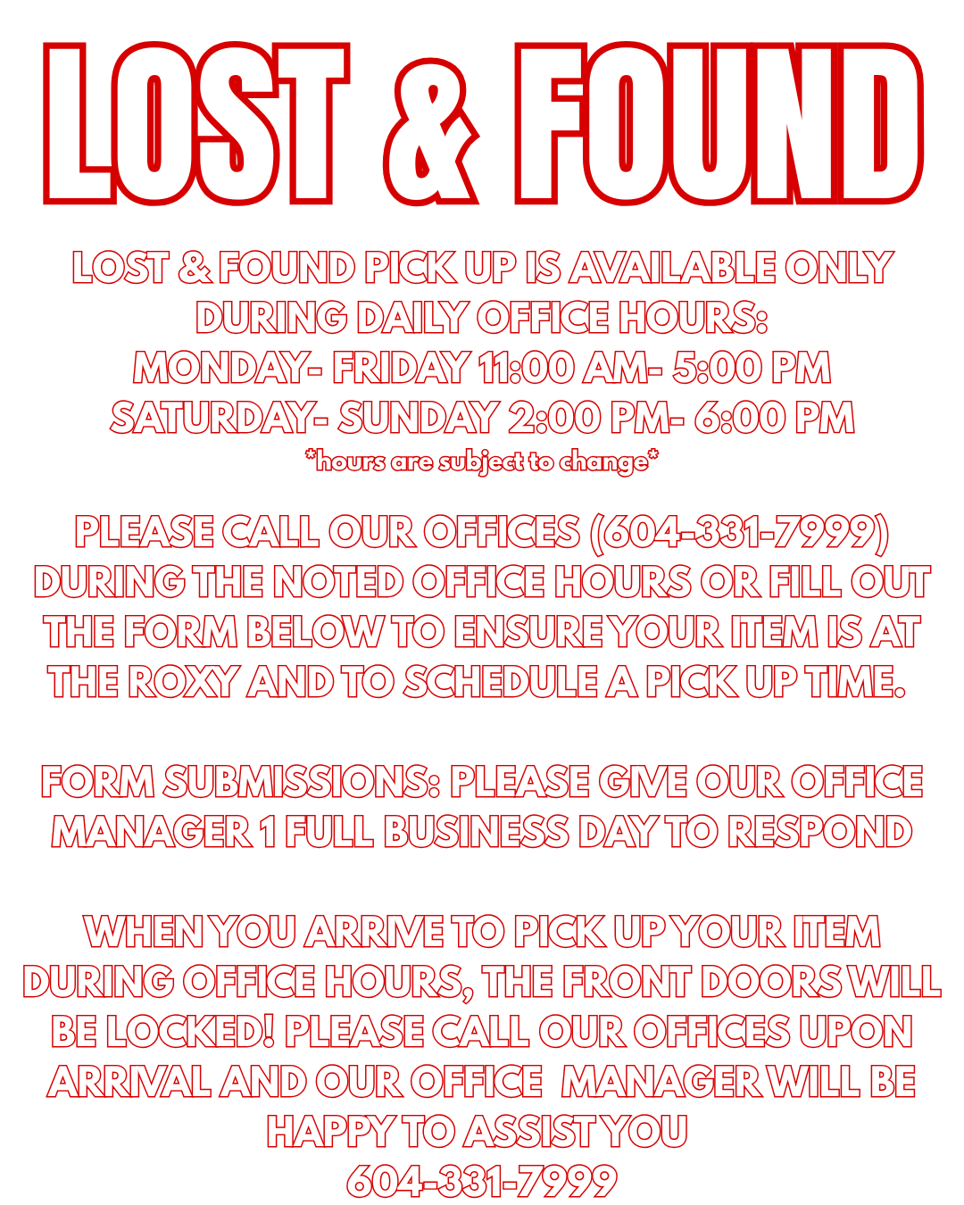 ** please note our night staff do NOT have access to our lost & found during night club operating hours **